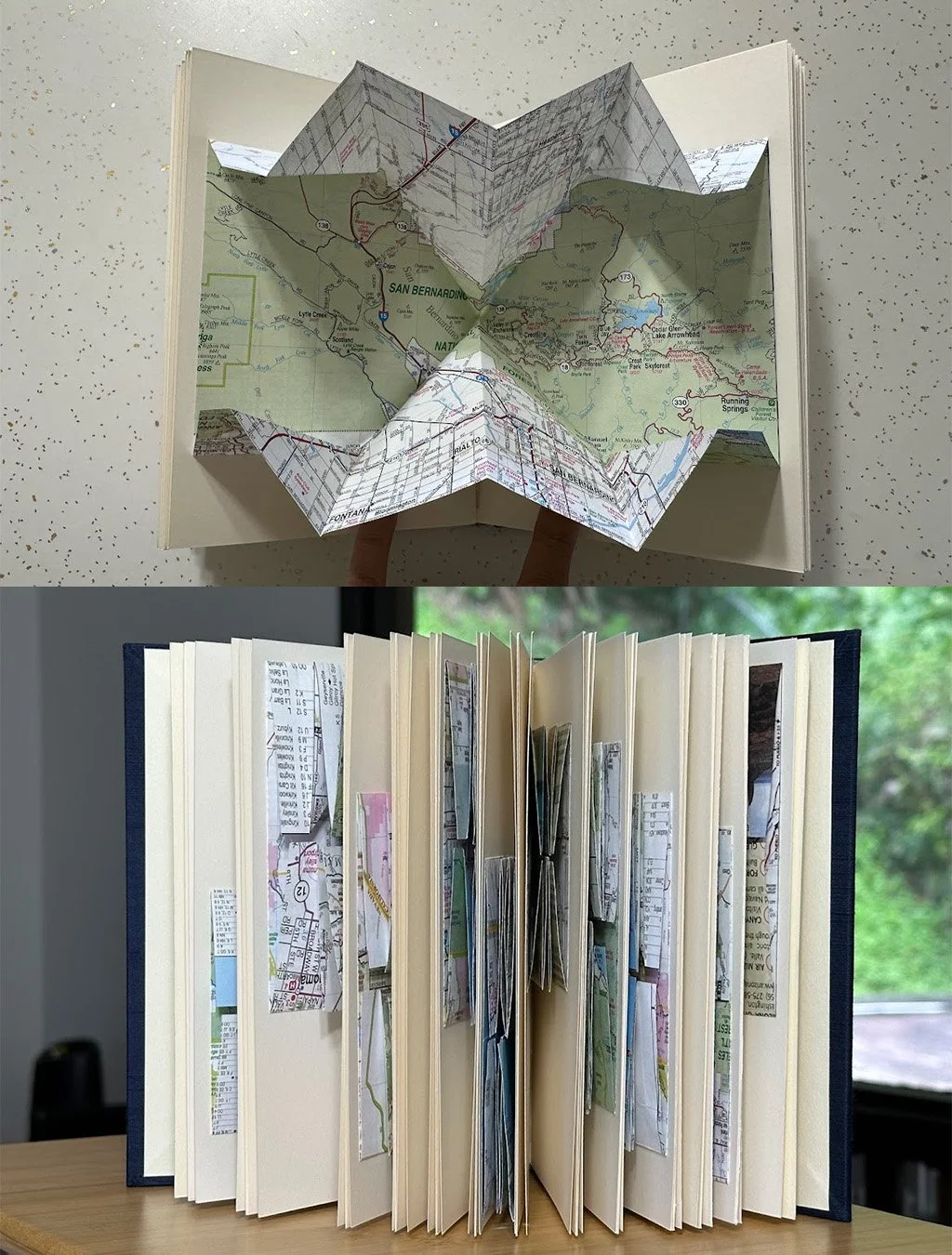 In this two-day intermediate class, students will create a traditionally bound book that incorporates folded maps designed to open and close seamlessly with the pages. The book itself follows a conventional structure, while the maps are carefully folded and attached so they open fully when a page is turned and fold flat when the book is closed.